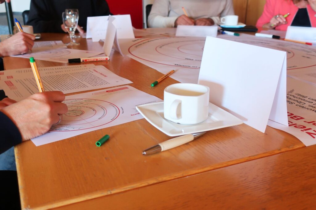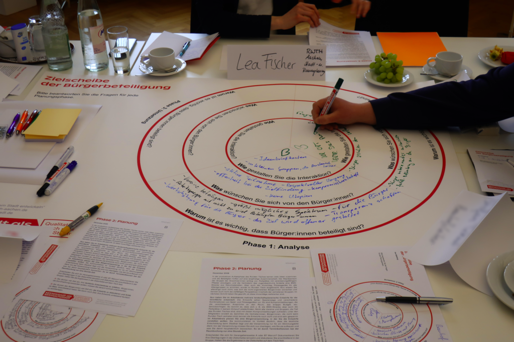 Entwickelt wurde das Planspiel auf Grundlage der Zwischenergebnisse meines Promotionsprojekts. Es fand zweimal jeweils mit den Mitarbeitenden einer planenden Verwaltung der kleinen Mittelstadt statt. Schließlich geht es darum, sich in einem geschützten Raum über die Herangehensweisen der Verwaltung an die Beteiligung und das Mitmachen von Bürger:innen im Rahmen der Stadtentwicklung auszutauschen. Die Teilnehmenden bekommen mit der sogenannten „Zielscheibe“ (einer Tischvorlage zur Kategorisierung der Überlegungen in Form einer Zielscheibe) ein Reflexionstool an die Hand, mit dem sie ihr implizites Praxiswissen strukturieren und explizieren können. Anwenden können sie dieses Tool in drei Runden in jeweils unterschiedlichen fiktiven Situationen der Interaktion zwischen Verwaltung und Bürgerschaft. Sie entscheiden sich in ihren Kleingruppen jeweils zwischen zwei Handlungsoptionen, wie sie den Beteiligungsprozess gestalten, und ziehen zur Begründung die Zielscheibe heran.
